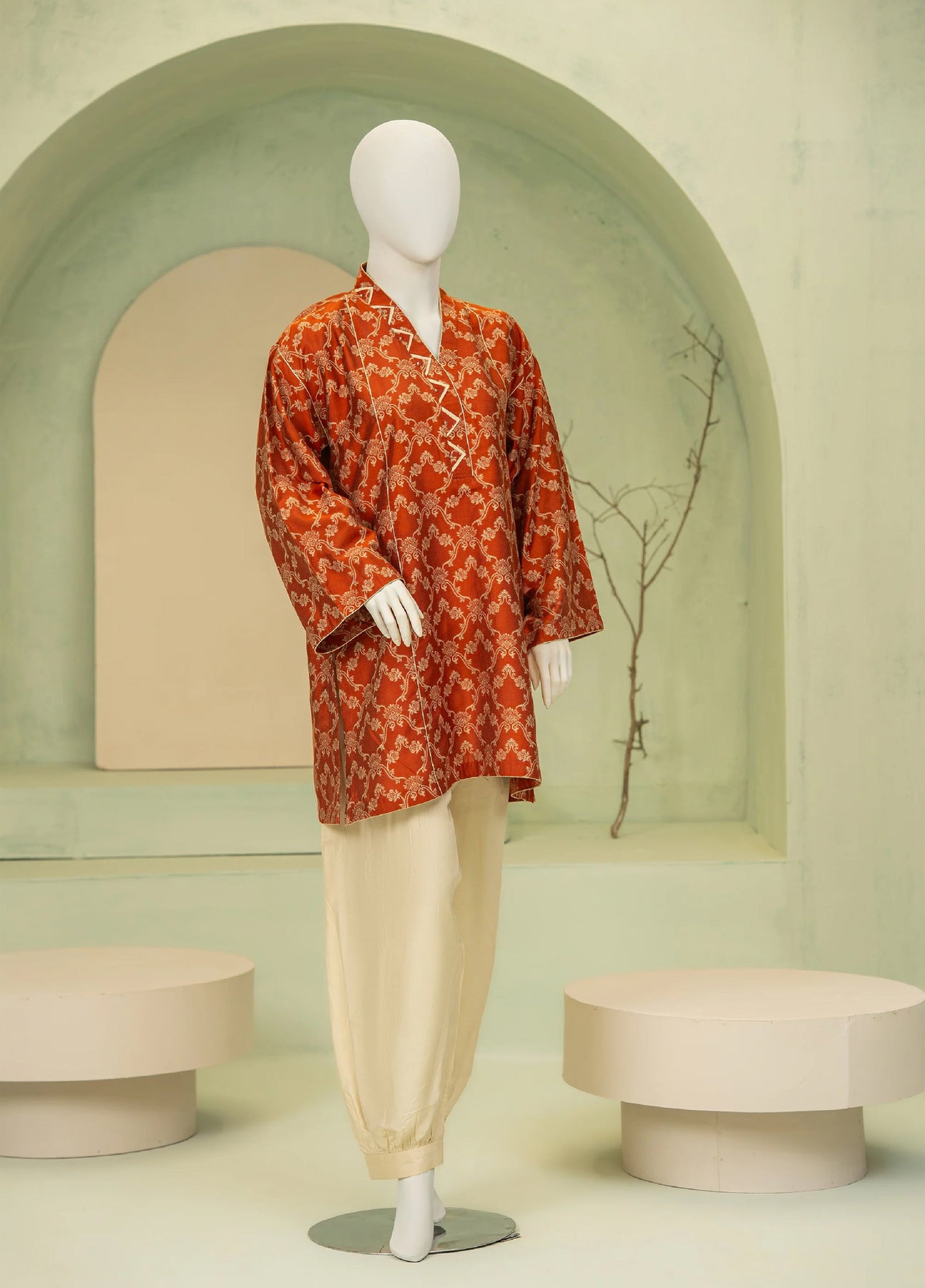 A refined rusty two-piece set featuring a relaxed-fit kurta with an intricately detailed neckline. Paired with a stylized loose shalwar, this ensemble perfectly balances effortless comfort with understated elegance.