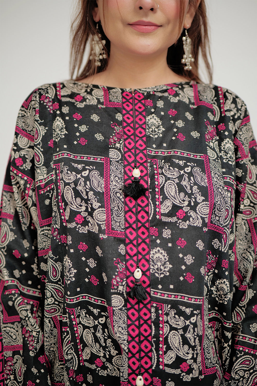 Front open straight cut shirt with border finishing all over embellished with tassels and seashells paired with loose cut pants.