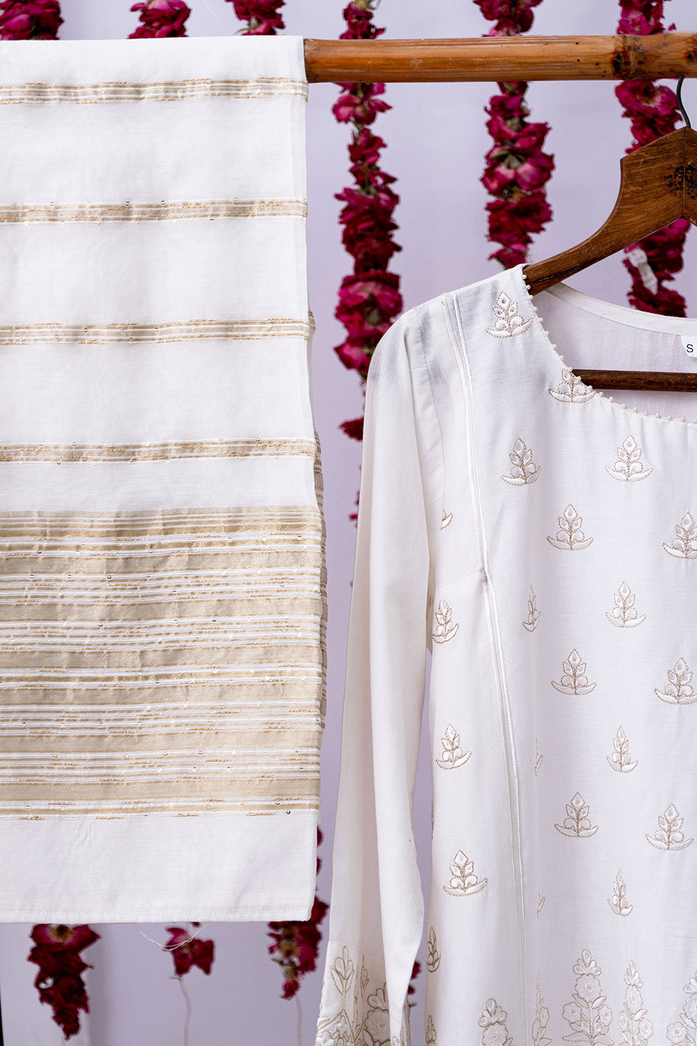 Straight cut shirt with all over embroidery paired with pleated cut pants and khaddi net duppatta.