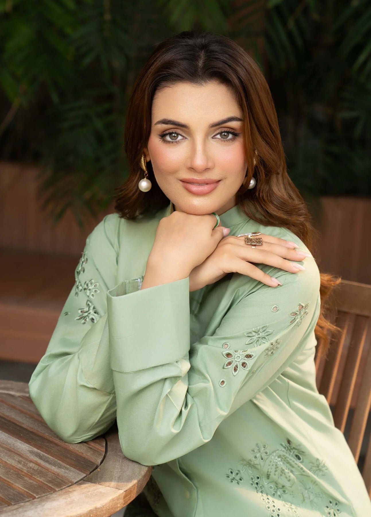 The Noa Lawn Embroidered 3 Piece Stitched set features a refreshing mint color crafted from soft cotton lawn fabric. The shirt showcases intricate Scheffli embroidery, adding refined texture and elegance. Complemented by a matching cotton lawn bell bottom, this ensemble offers a modern silhouette with comfortable wearability, ideal for stylish, everyday sophistication.