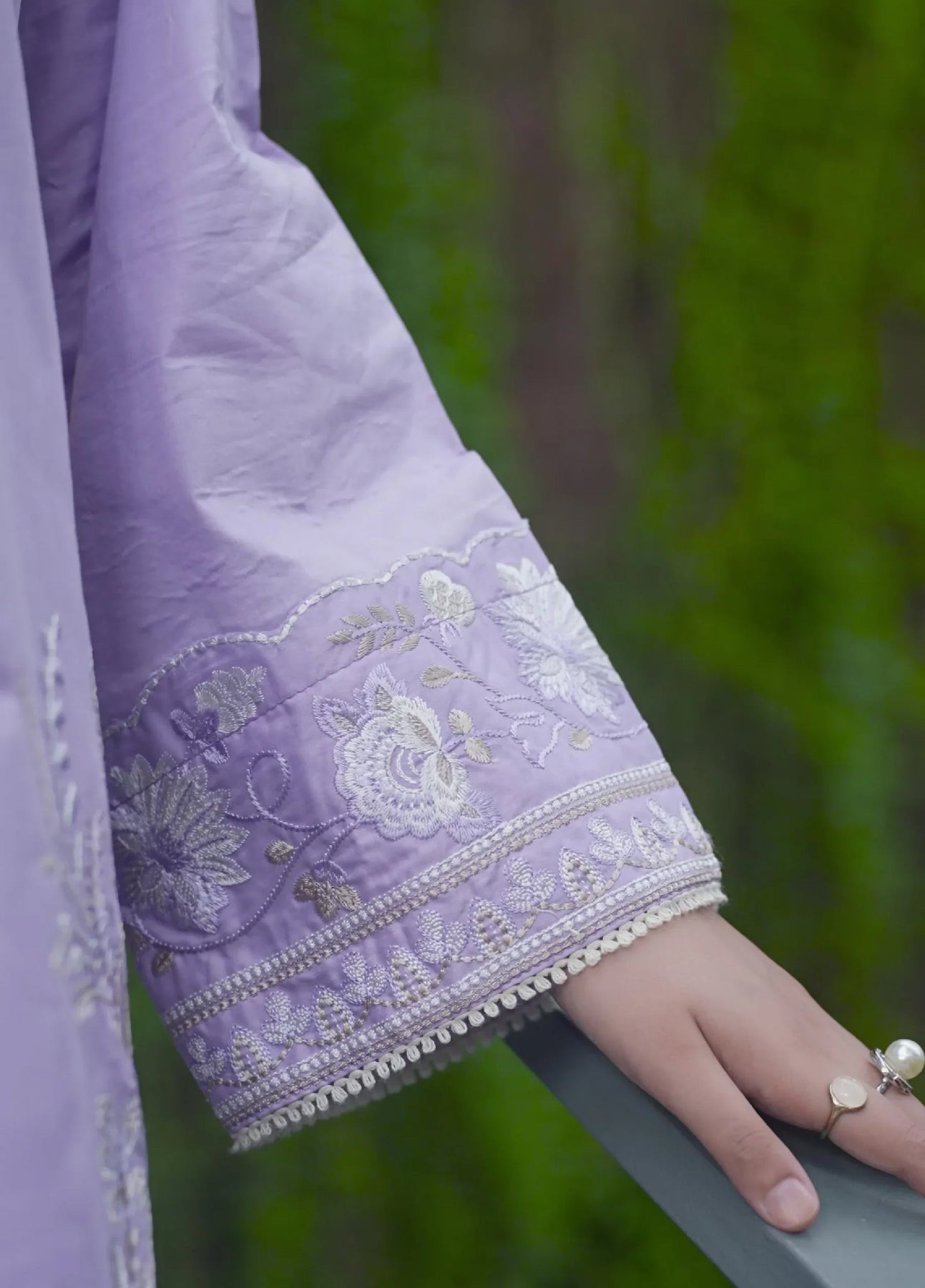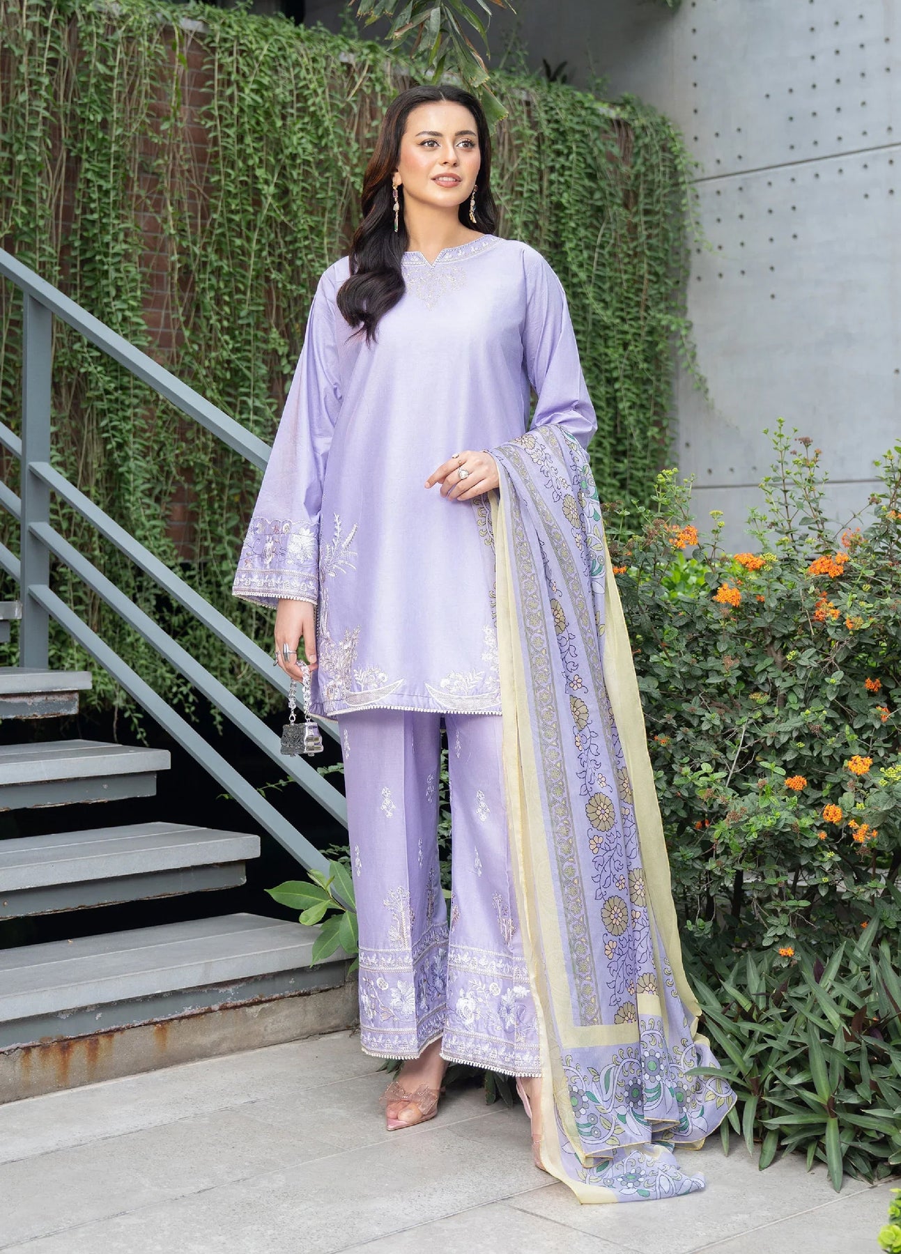 The Solene Lawn Embroidered 3 Piece Stitched set in soft lilac features a breathable cotton lawn shirt with elegant embroidery, offering a delicate and refined appearance. It is paired with matching cotton lawn embroidered bell bottoms that enhance the silhouette with graceful detailing. The silk printed dupatta adds a luxurious finish, making this ensemble perfect for sophisticated occasions.