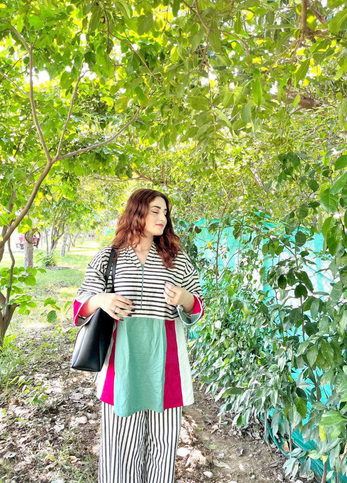Elevate your everyday style with this trendy striped and colorblock cotton 2-piece suit for women. Made from premium breathable cotton, this outfit features a loose-fit shirt with bold black and white stripes, complemented by striking green and pink panels for a pop of color. Paired with matching striped trousers, this set is perfect for casual outings, summer strolls, or relaxed weekends. The lightweight fabric ensures comfort and breathability in warmer weather, making it a must-have for your summer wardrobe.