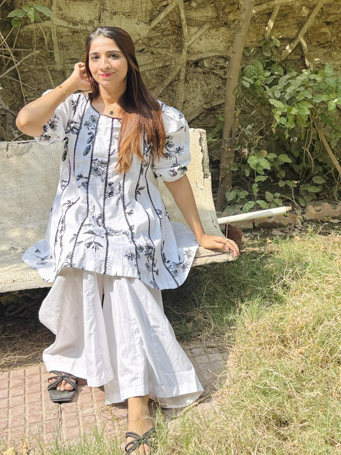 The top features a beautiful floral print with delicate lace detailing, adding a touch of elegance without trying too hard. Paired with relaxed Dhaka-style wide-leg pants, this outfit gives you that effortless vibe — stylish but super comfortable.