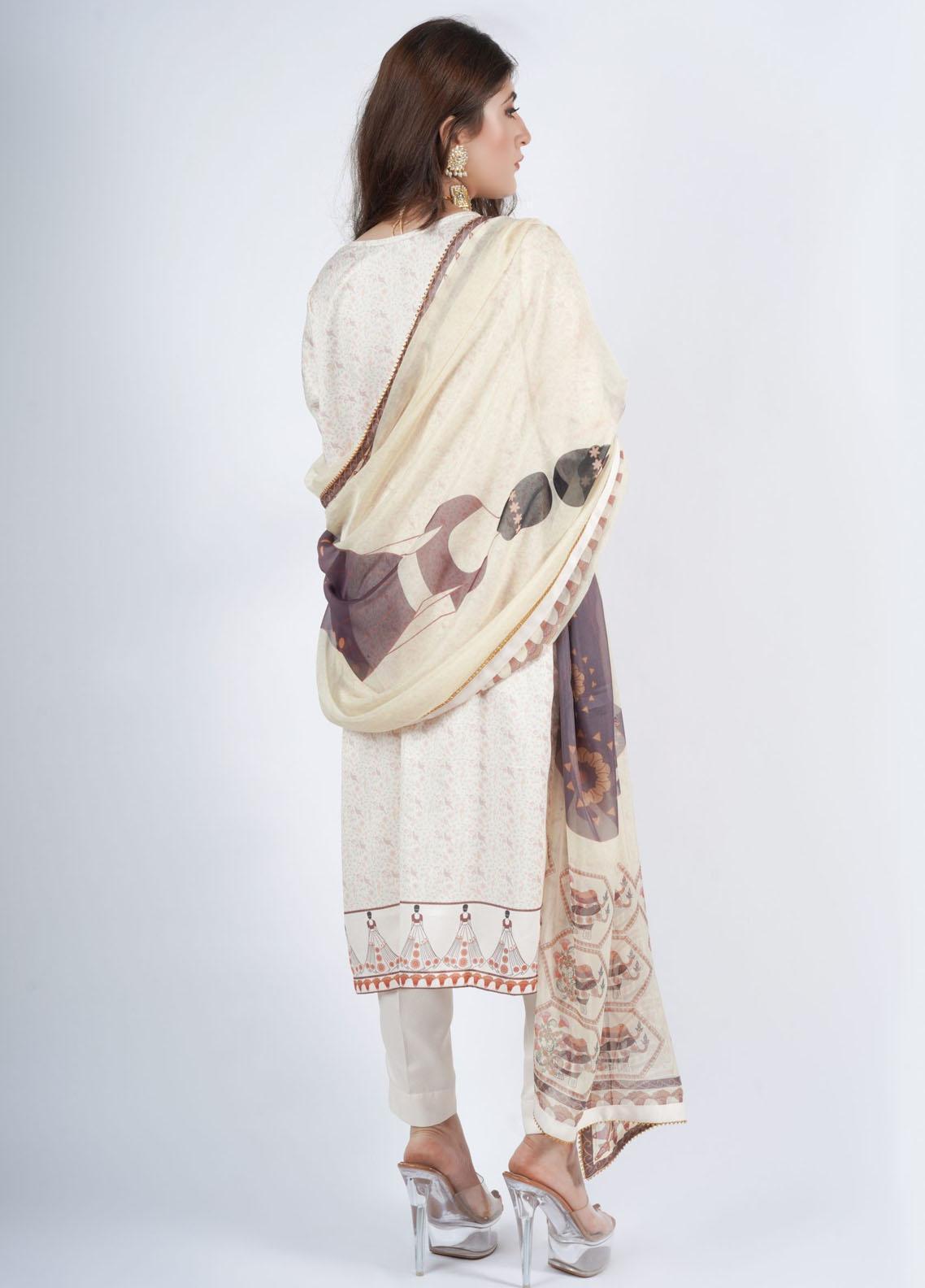 Winters never looked this beautiful. Combination of Mughal inspired elephants, motifs, and florals with geometric shapes, together with rich color palette elevates this design to another level. Skin shirt base with accents of brown, camel, green, and other colors, print of elephants having intricate design, floral motifs, and geometric shapes, and other intricate motifs with wide hem printed border giving this design a shine with every turn. To top it off equally digitally printed silk Dupatta having two Mughal queens and floral border all over Dupatta gives it classic allure and contemporary elegance, this design will surely be a unique addition to your wardrobe.