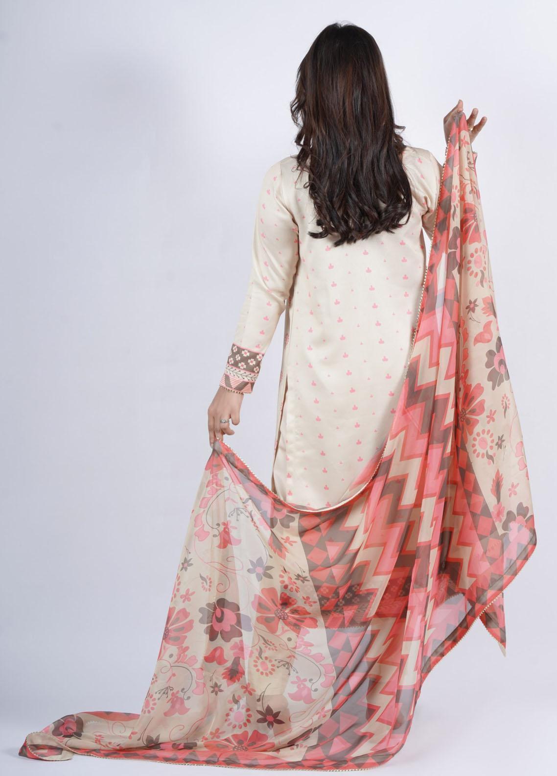 Engross yourself in an ensemble that showcase shirt with a combination of floral print and intricate border on hem and neckline consisting on geometric and floral motifs combined with the plain trouser that represents timeless sophistication. The printed silk dupatta features intricate designs which comprises the motifs such as floral, zig zag and geometric elements in a horizontal 3 parts divided way, in center we have chevron print of three subtle colors and in other two parts we have combination of different flowers, in border we have wide border of square shape all over with various colors and adds a rich and elegant touch to the ensemble.