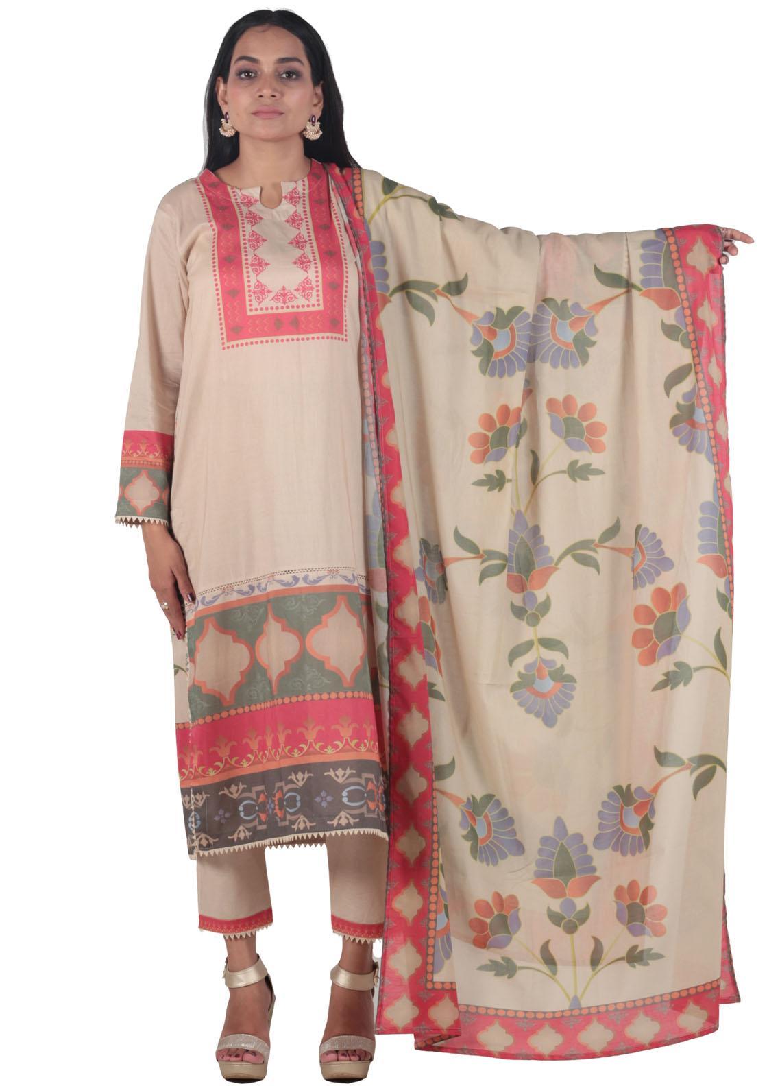 The shirt is adorned with a lively floral print on border featuring an array of colors that exude vitality and aplomb further enhanced by a printed neckline which is a combination of geometric floral motifs The coordinating trouser consisting of repetition of floral printed border adding a touch of elegance the dupatta showcases the captivating border of floral motifs bringing a cohesive charm to the ensemble This dress promises a lively style that captures the essence of autumn