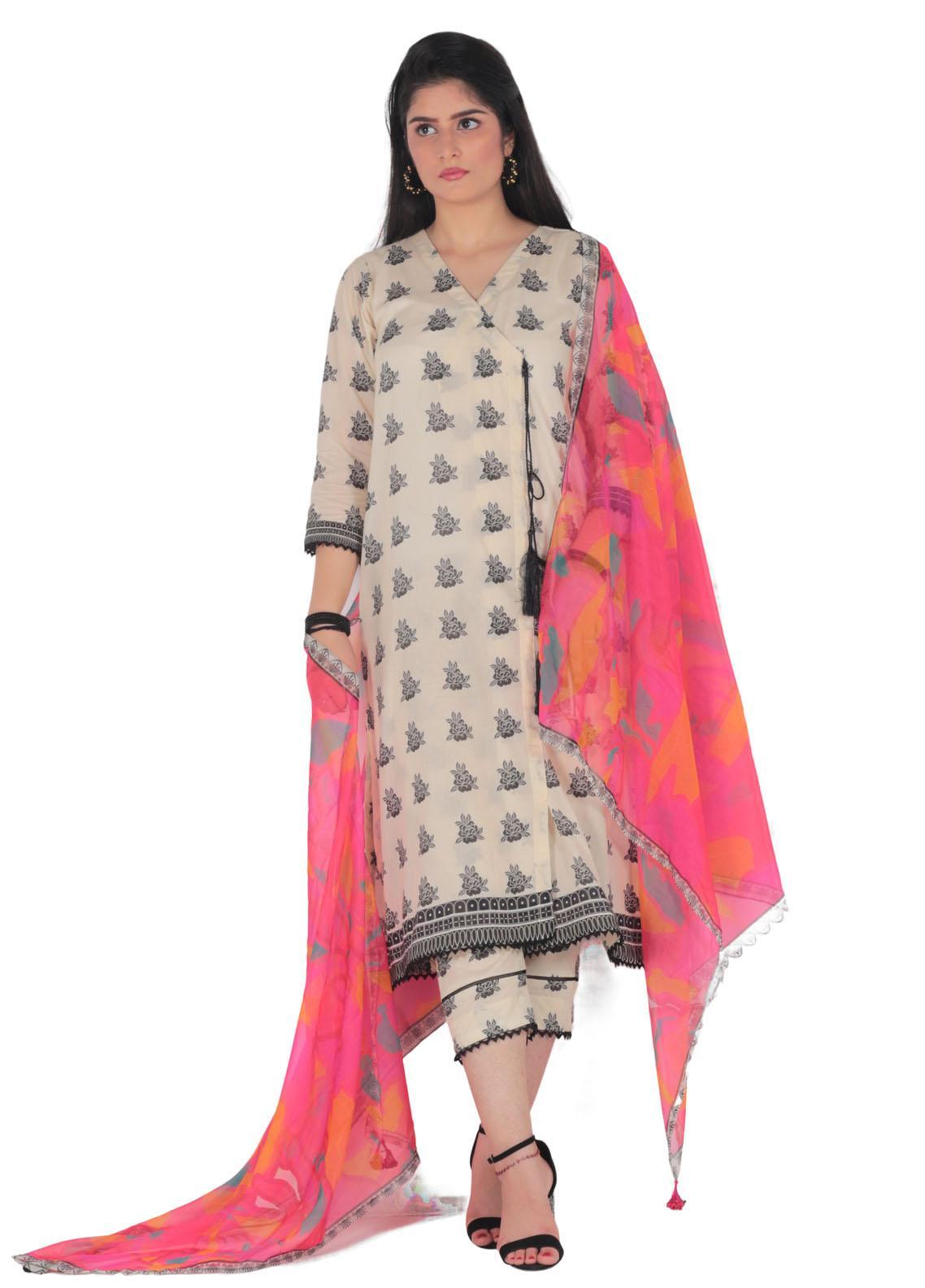 Immerse yourself in an ensemble consisting on floral seamless repeat pattern with the geometric horizontal border print combined with the same seamless floral print trouser and the printed dupatta features variegated iridescent colored abstract motifs which adds the contrast to the attire
