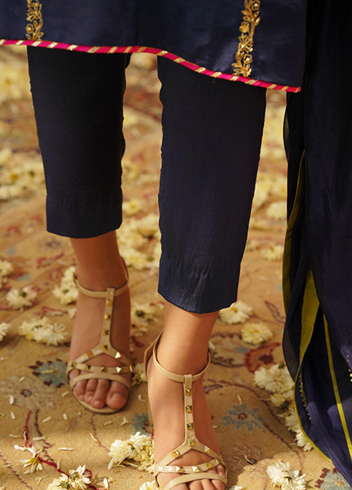 This blue Raw silk kurta has a heavy hand worked neckline and a Chatapati koti style and sleeves with hand work. It is paired with a matching straight pants and a blue Raw silk dupatta with gota lace and contrasting finishing patti all over.TheseLuxury Formal Women Suits, Ready To Wear, wedding dresses, are perfect for your festive events. Choose from Zaaviay, your favourite online,Pakistani Clothing Brand