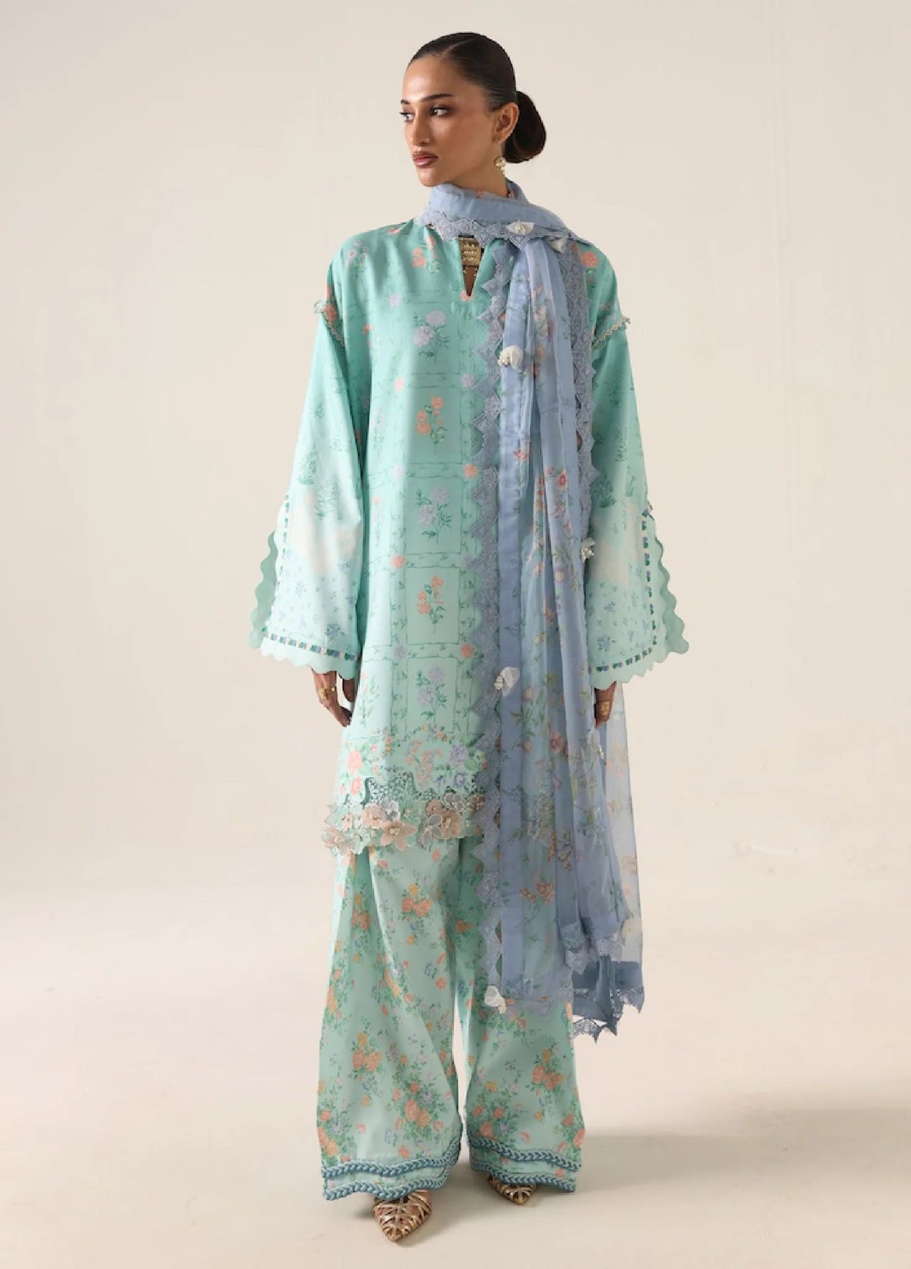 Blue lawn shirt and trousers adorned with soft pink rusty orange floral prints, giving it a dreamy look, beautifully paired with a contrasting periwinkle chiffon dupatta. This unstitched printed ensemble captures effortless elegance with a refreshing blend of pastel hues and graceful detailing.