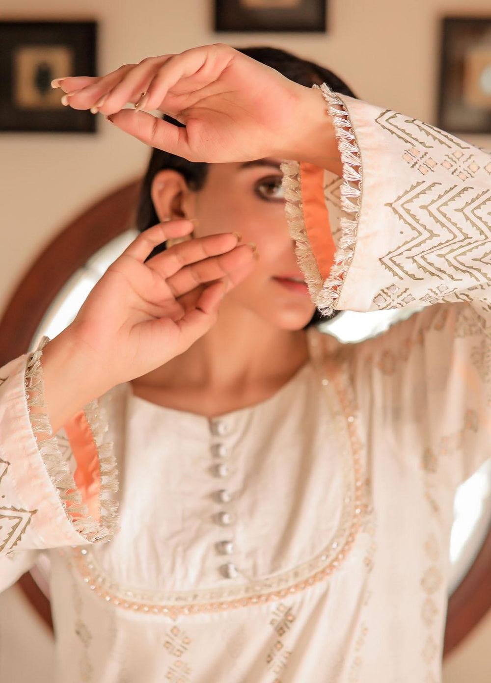 Our Beautiful Cotton 3 Pieces Have Gold, Peach, And Silver Block Printing With Intricate Motifs On The Shirt Along With The Fusion Of Different Laces, Tilla Balls, And Fabric Manipulation, Beautiful Handmade Tussles On Cut Work Adding More Enhancement In Design, Straight Style Sleeves Having Organza And Laces Manipulation .Chiffon Block Printed Dupatta With The Fusion Of Peach,Gold And Silver Color,Having 3 Different Laces Manipulation And Handmade Tussles. Kali Hijar Trouser Having Gota And Dhanak Work On It. Fabric Pure Cotton, Crinkle Chiffon Color Offwhite