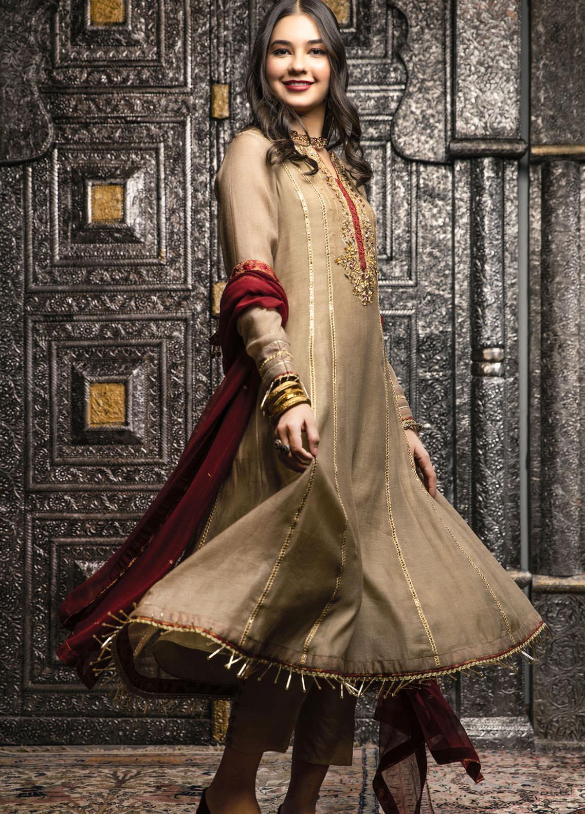 Jhoom is a flarely pishwas with intricate gota kora and dabka work on the neckline The beautiful dress is embellished with gold laces and with maroon banarsi The flared paneled frock is complemented with beige raw silk straight pants and a maroon chiffon dupatta