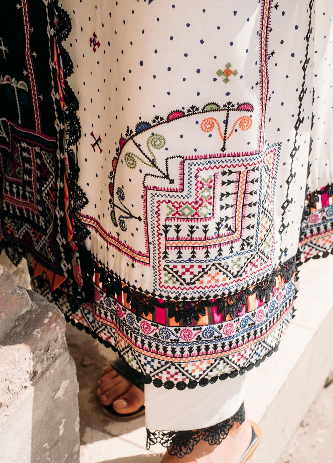 Burn bright this winter in Ziba. A gorgeous ivory canvas is adorned with meticulously rendered tribal embroideries in multi-hues. Paired with a beautifully embroidered ebony chaddar and this elegant design is sure to keep you stylishly warm through the cold season.