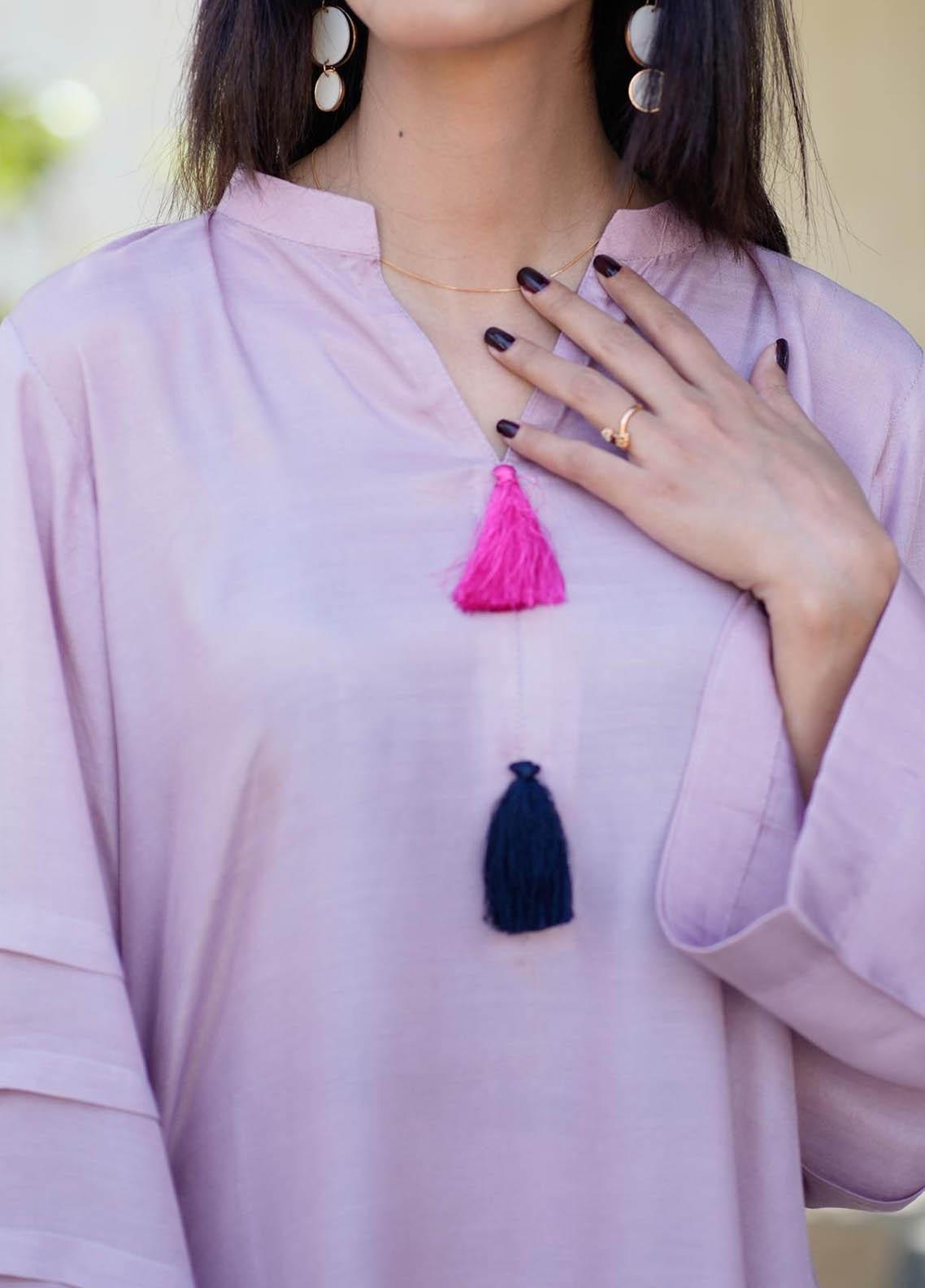 Its a cotton silk two piece suit V neck line shirt and some details on sleeves with matching cullote.