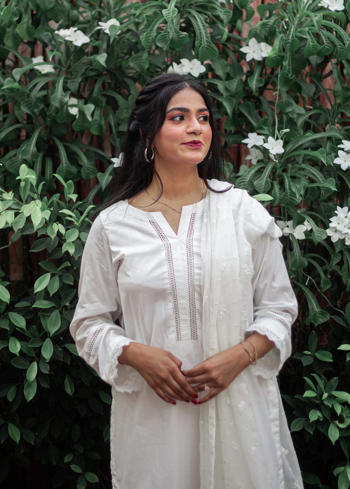 Its a white cotton three piece dress with lace detailing on neck, sleeves and daman along with embroidered chiffon dupatta.