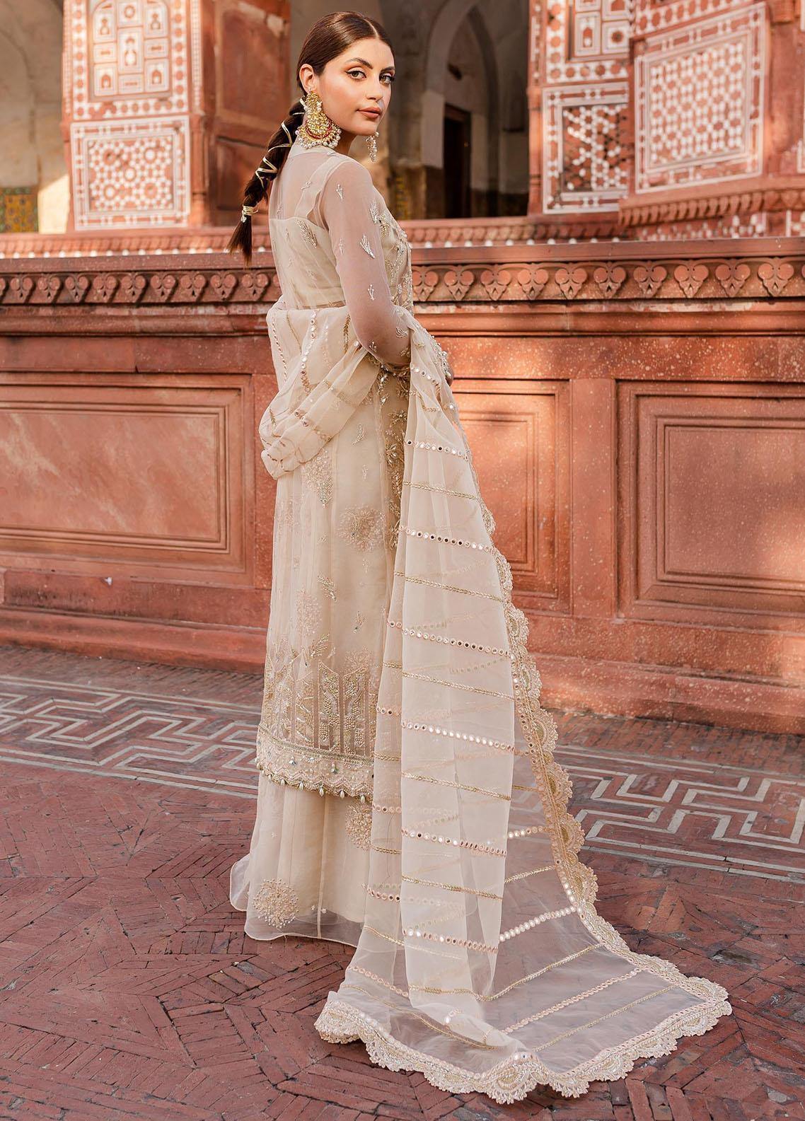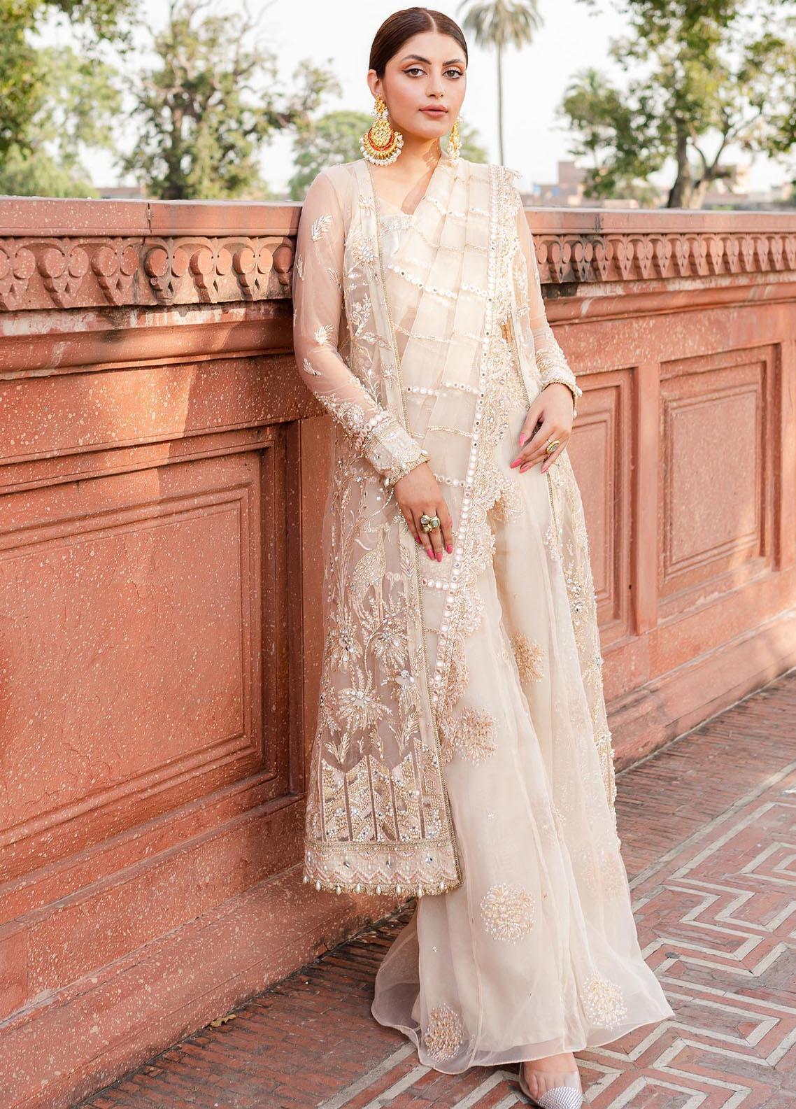 Naira Features A Creamy White beige Jacket Embellished To Perfection With Hand Worked Details And Splendid Embroidery The Elegant Embroideries Depict A Flora And Geometric Pattern To Complete The Look It Is Enhanced With A Fully Embellished Drape Dupatta Rawsilk Azaar Pants And Undershirt To Give Out A Heavenly Royal Vibe