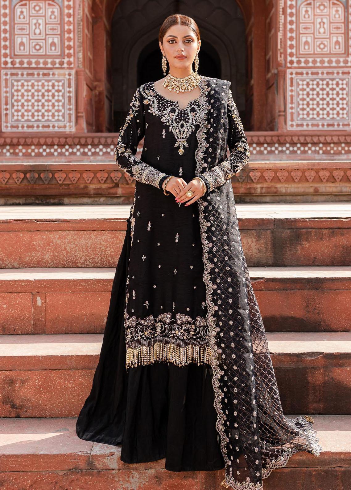 Maya Feature A Black Shirt Crafted From Rawsilk Base Adorned With Modern Floral Embroideries And Hand Embellishments Giving It A Regal Look And Hem Adorned With Heavy Hangings It Is Effortlessly Paired With Rawsilk Flared Sharara Pants And Embroidered Organza Dupatta Adding Charm To The Luxurious Feel Of The Attire