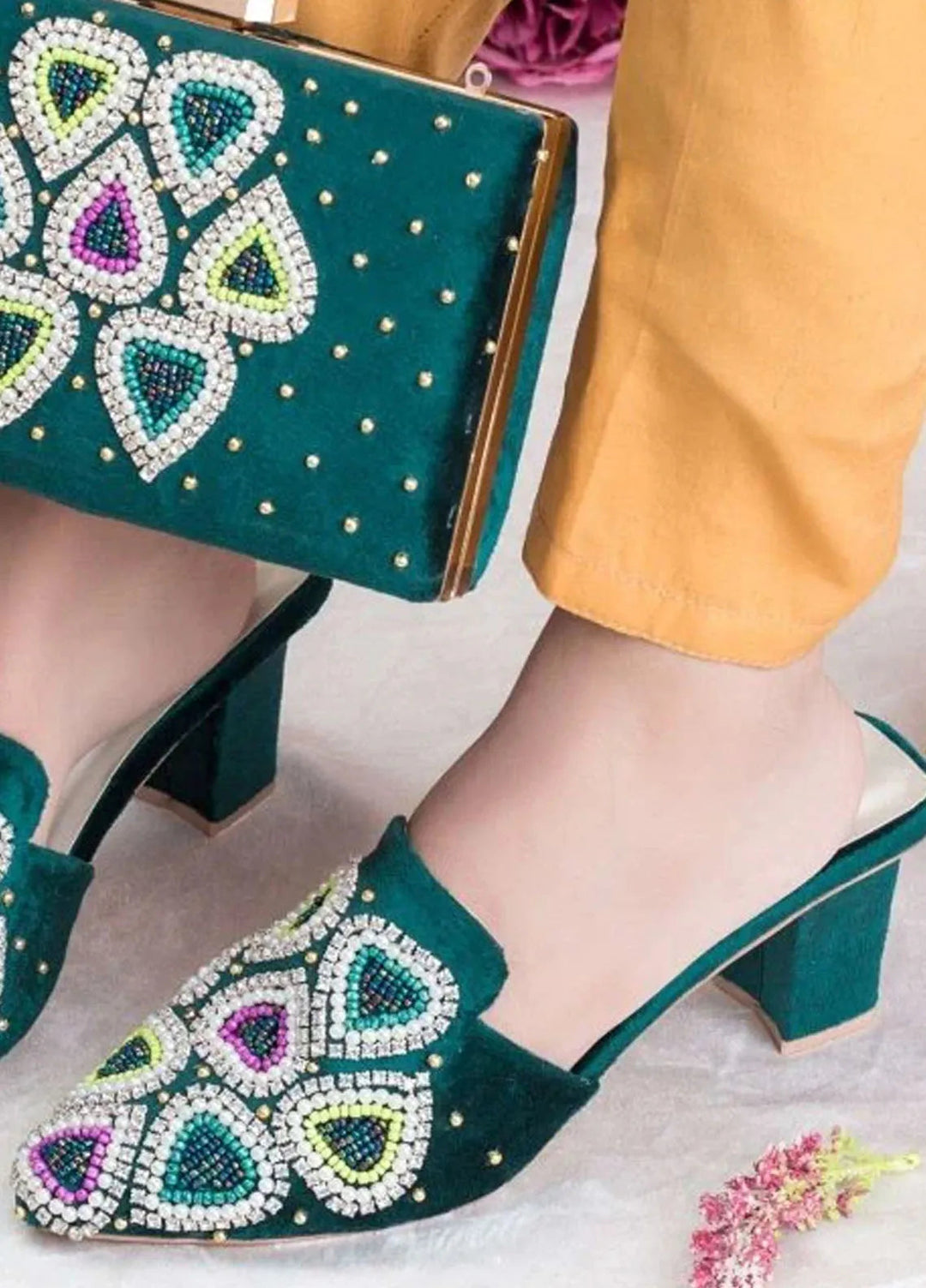 Zuruj Festive Style Heel Mules X Clutch HMC-240-Bottle Green