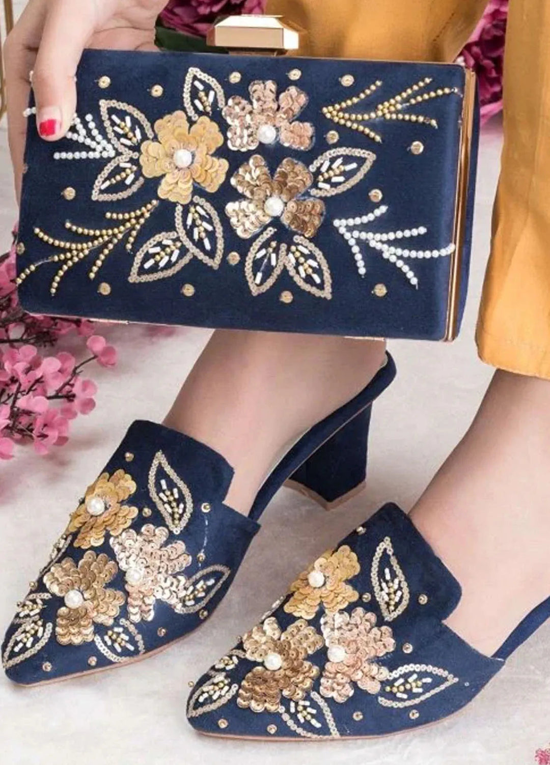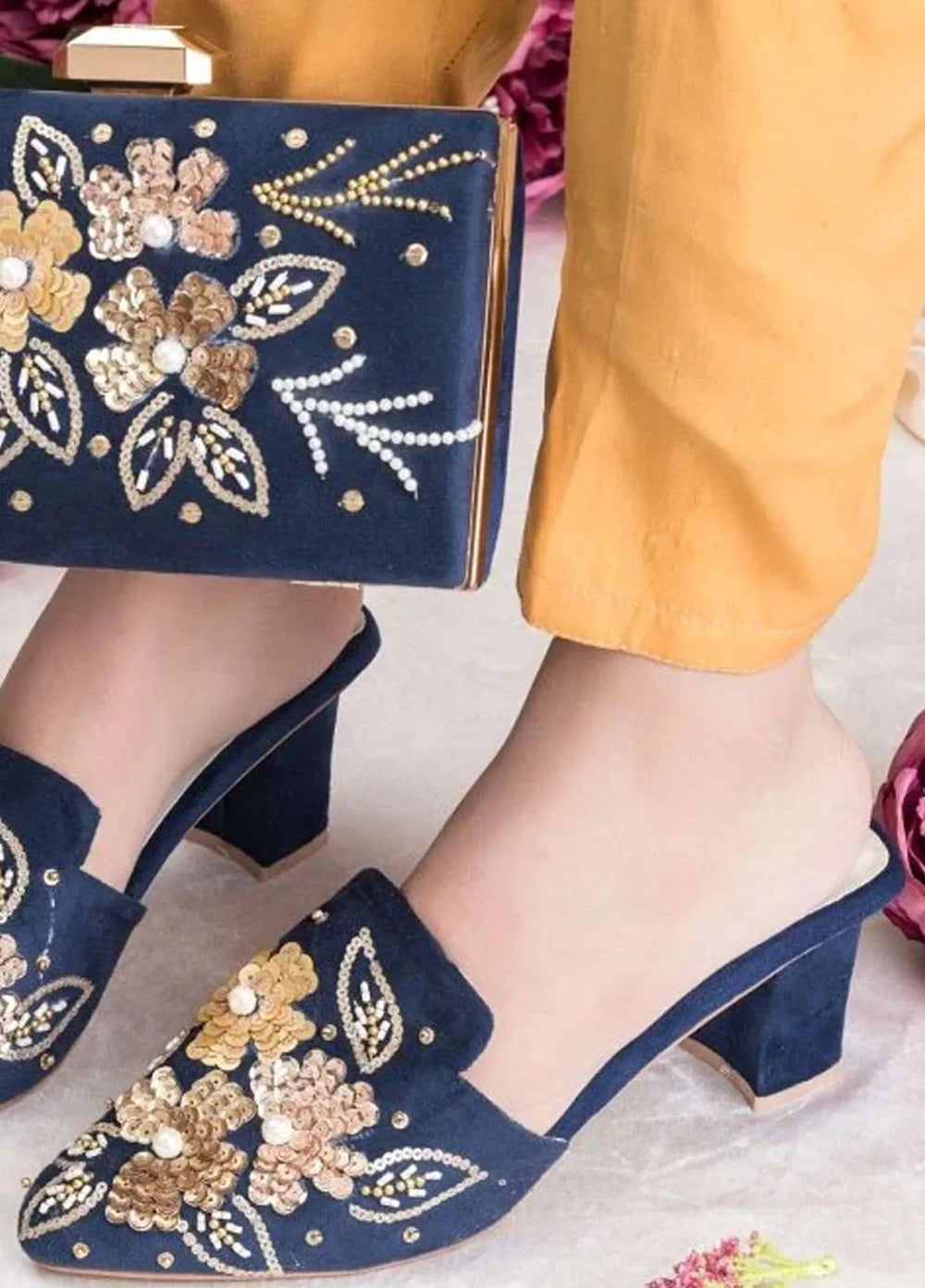 Zuruj Festive Style Heel Mules X Clutch HMC-256-Navy Blue