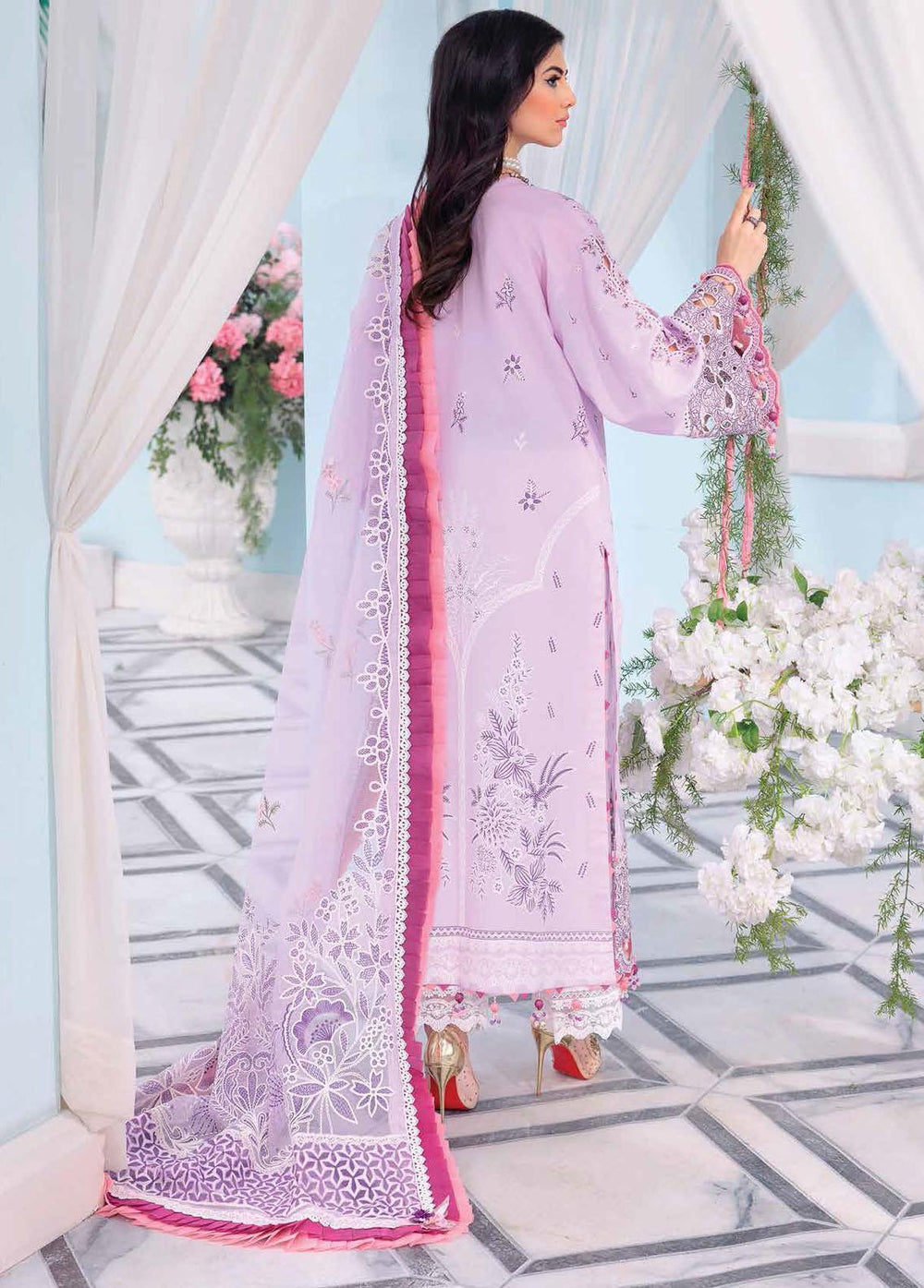 Bringing to life the feminine allure a soft lilac hue is enlivened in Ayeda. Featuring intricate and delicate floral motifs blooming in all their glory in pink, purple and sage silk threads, this stunning ensemble is paired with tonal trousers and a lavishly embossed rocket net dupatta to make it more flattering. Style it as an elongated shirt and turn heads this festive season.Embossed and Color Paste Printed Rocket Net Dupatta Embroidered Dupatta Pallu Border Embroidered Lawn Front Centre Panel Embroidered Lawn Front Panel Spray Right + Left Paste Printed Lawn Back Embroidered Lawn Sleeve Spray Embroidered Neckline Border Embroidered Front Daman Border 01 Embroidered Front Daman Border 02 Embroidered Front Daman Border 03 Embroidered Sleeve Border 01 Embroidered Sleeve Border 02 Embroidered Sleeve Border 03 Embossed Printed Trouser Border Dyed Trouser