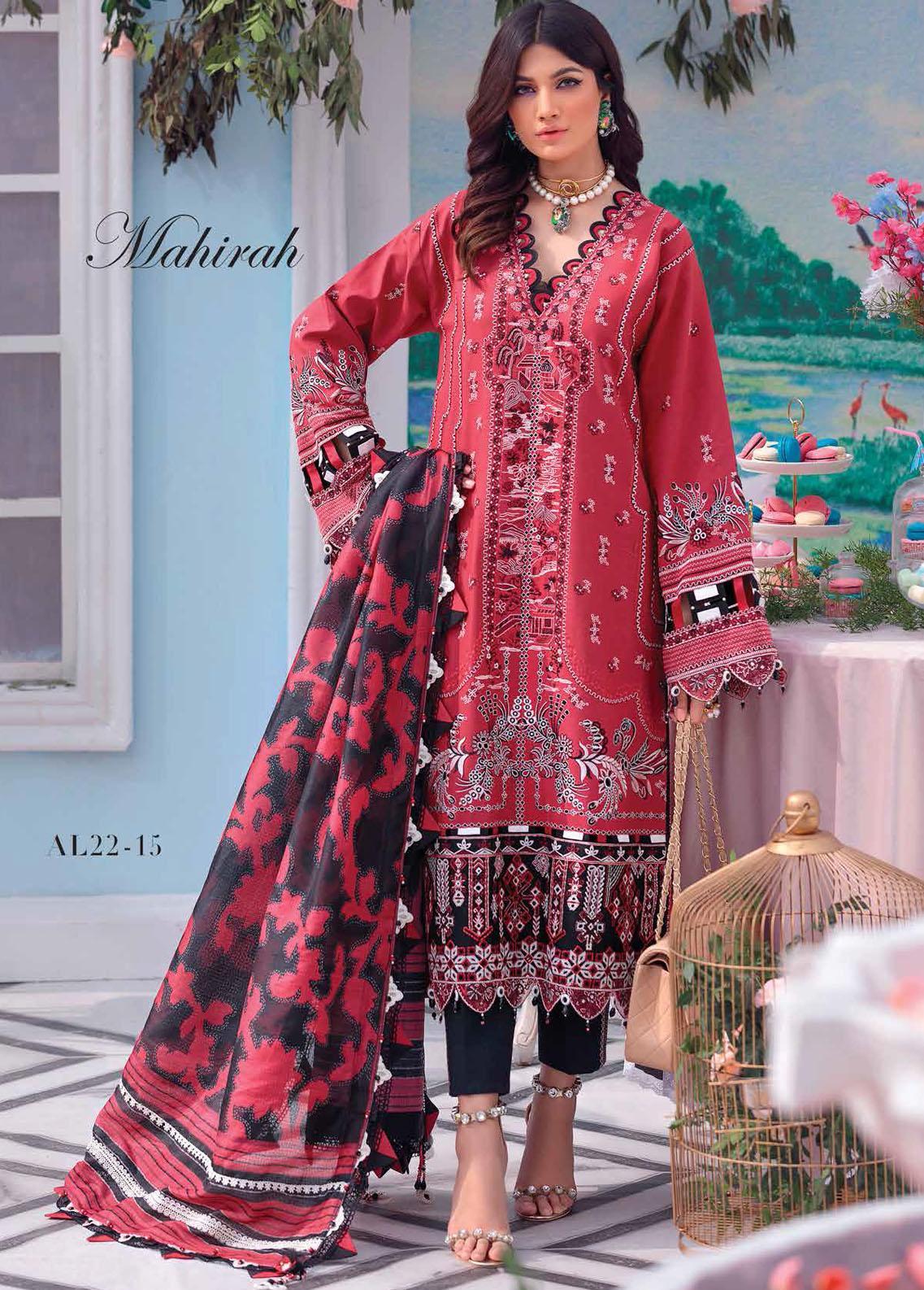 An elegant and refined design, Mahira features beautiful floral and ornamental motifs in exquisite monochromatic hues on a sumptuous scarlet canvas. Paired with a vibrantly printed woven silk dupatta boasting a smattering of delicate ebony floral motifs this classic festive look will be timelessly elegantPrinted Silk Woven Dupatta Embroidered Lawn Front Schiffli Panel Right Embroidered Lawn Front Schiffli Panel Left Embroidered Lawn Side Panel Spray Embroidered Lawn Schiffli Sleeve Paste Printed Lawn Back Embroidered Front Daman Border 01 Embroidered Front Daman Border 02 Embroidered Back Border Embroidered Sleeve Border 01 Embroidered Sleeve Border 02 Embroidered Trouser Border Dyed Trouser