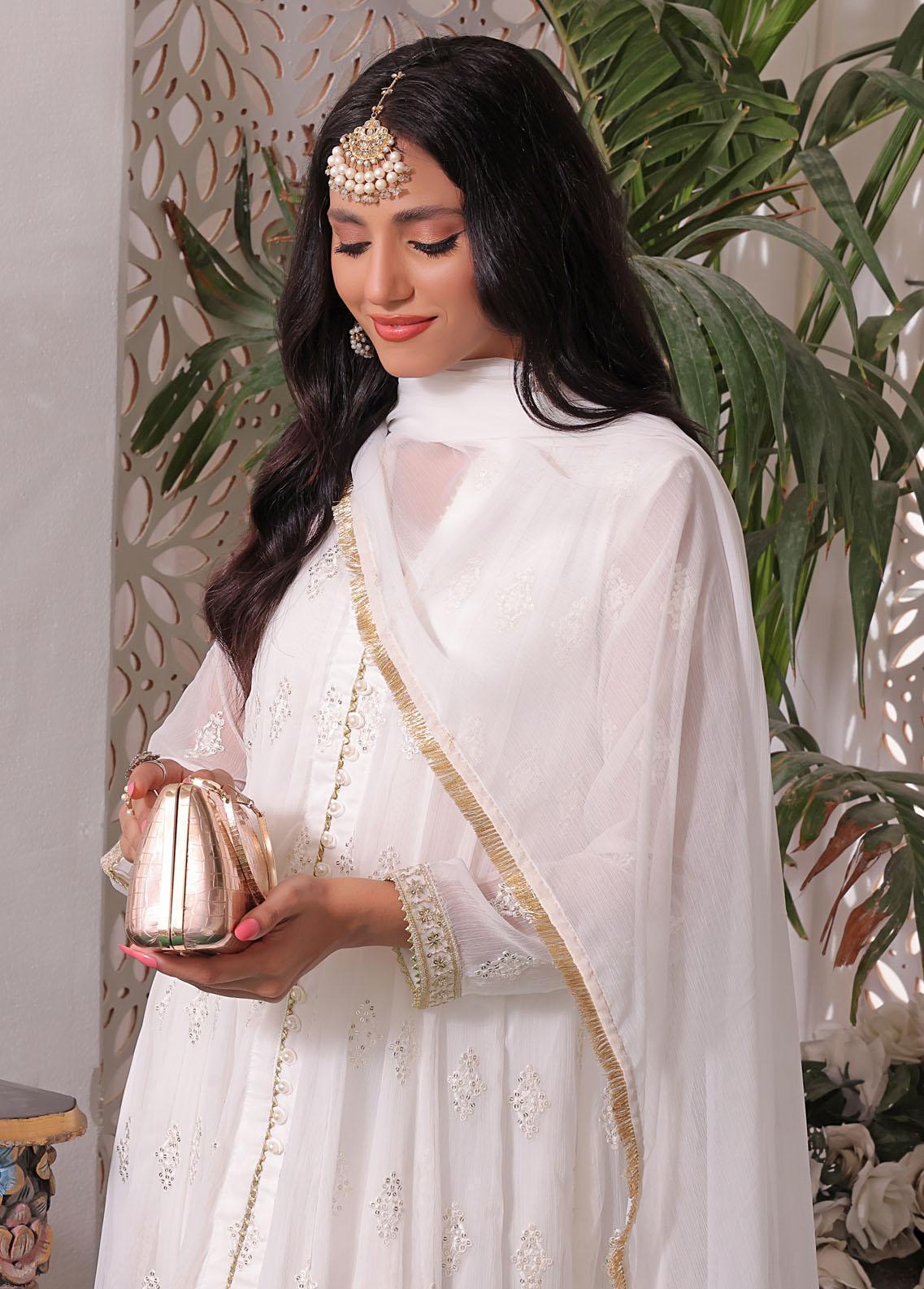 Meet the Ruby Chiffon Maxi Frock a charming choice for your formal events This stunning dress features delicate embroidery boti bunch exuding elegance With its front open style and a Dupatta adorned with pretty kiran lace you ll shine gracefully on your special day