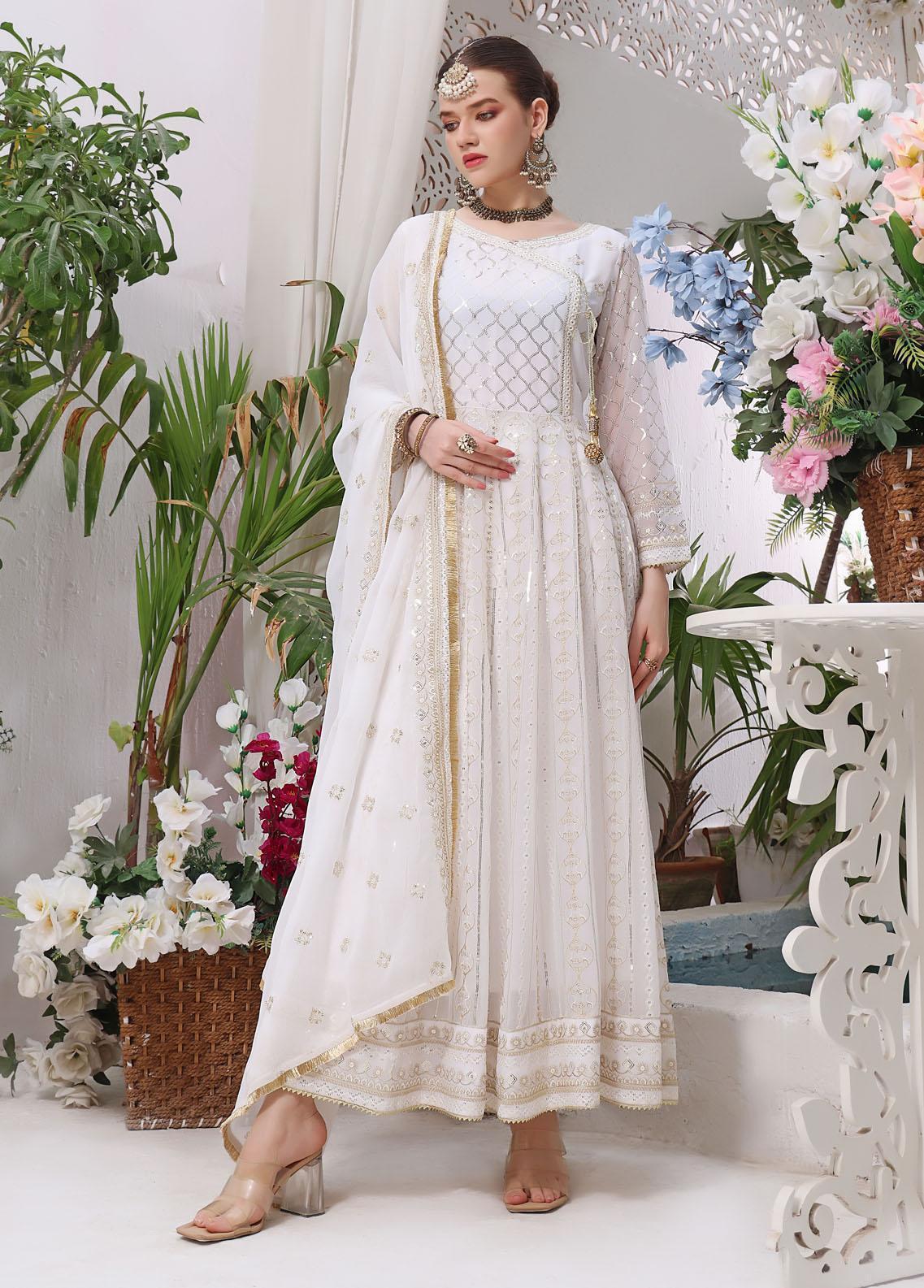 Uniquely charming this 3 piece anghrakha frock set enchants with chiffon s shimmering sequence and zari work embroidered flowers grace sleeves and dupatta corners The frock s special patterns and fine stitches paired with plain trousers exude simple elegance