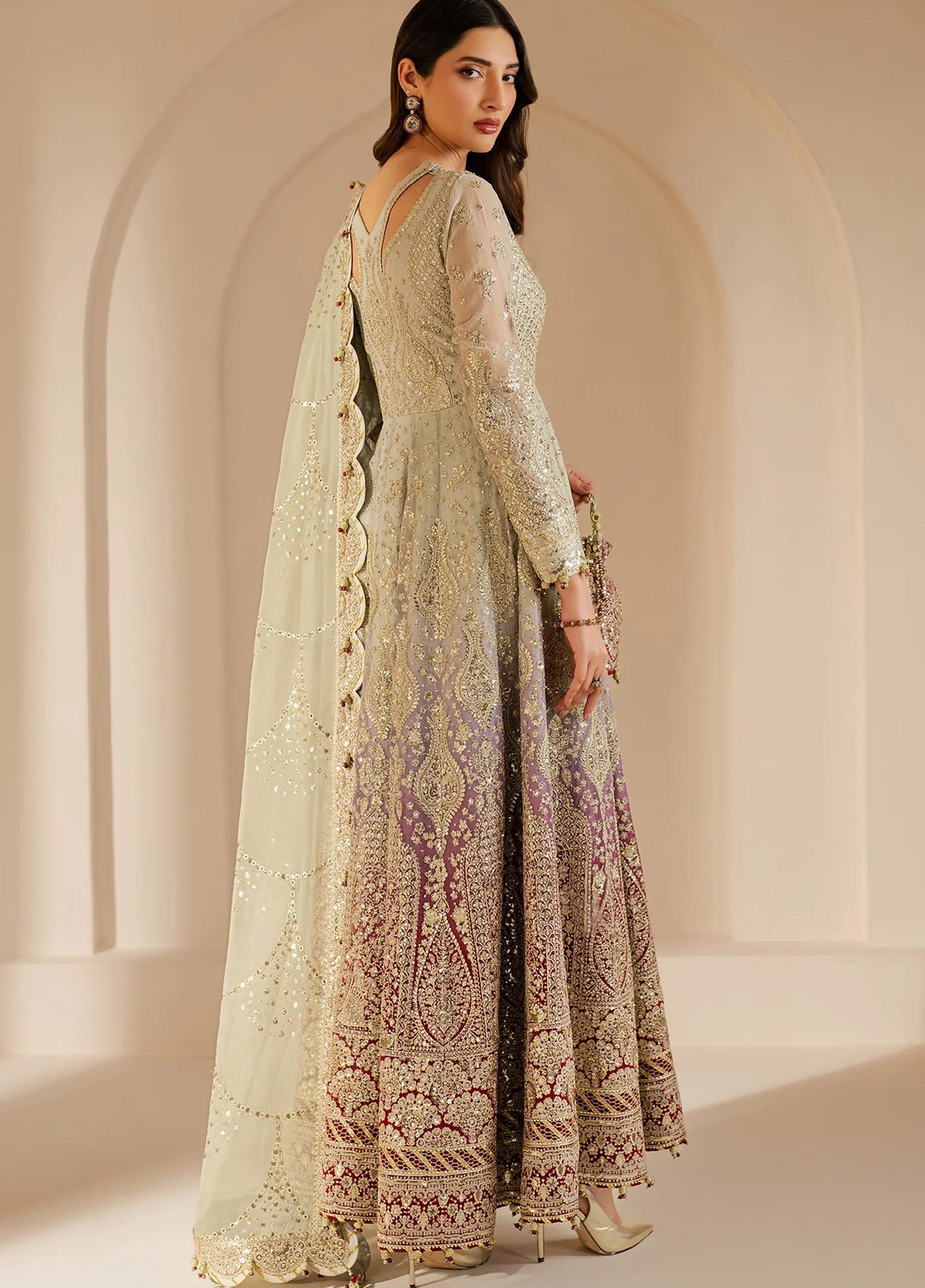 This EMBROIDERED CHIFFON WF'25-01 features intricate embroidery and digital printed designs on the front and back yokes, sleeves, and panels. The elegant organza dupatta is also adorned with embroidery and digital prints, while the rawsilk bottom completes the look. Elevate your style with this beautiful and detailed chiffon ensemble.