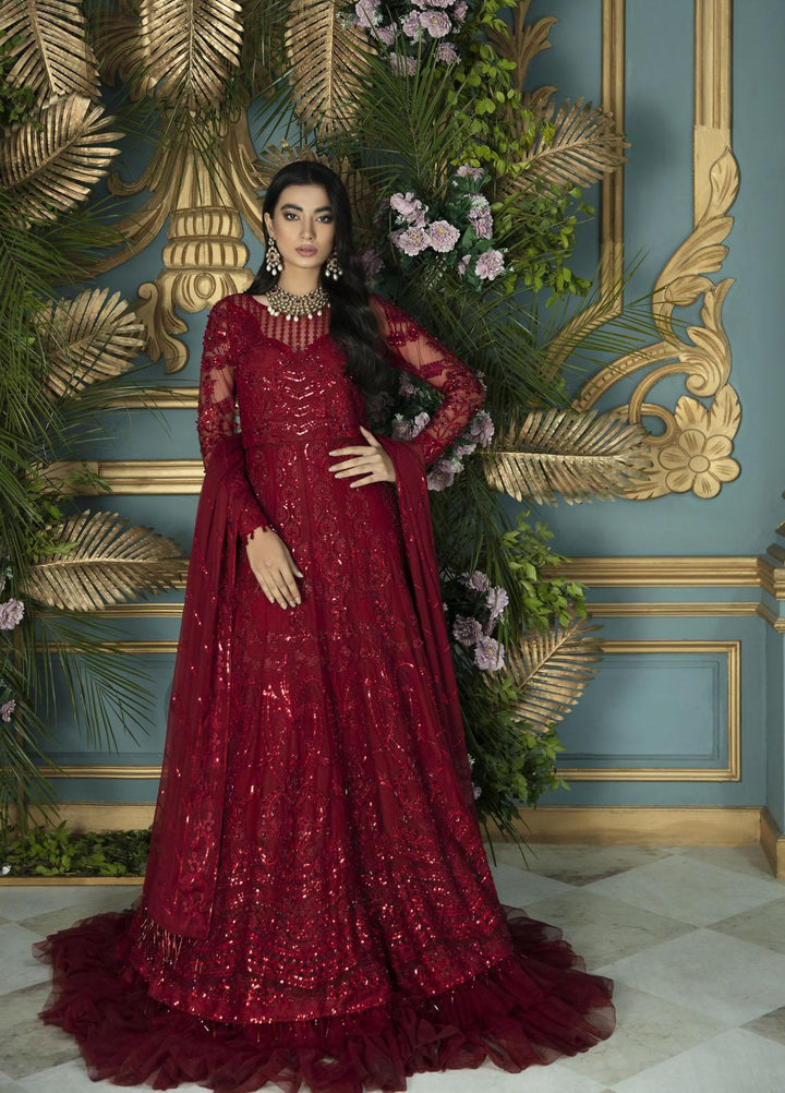 With the lustrous silhouette that Flavia embodies, the astonishing gown is crafted to perfection with worked front, back and sleeves. This deep red look is completed with the beautiful flared chiffon embroidered dupatta and ruffled skirt, giving it a heavenly charm